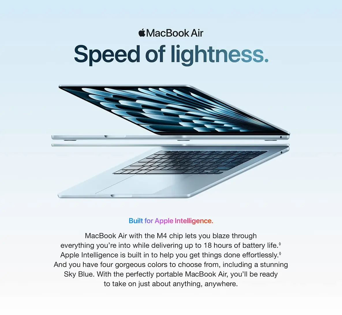 MacBook Air with the M4 chip lets you blaze through work and play. With Apple Intelligence, up to 18 hours of battery life, and an incredibly portable design, you can take on anything, anywhere.