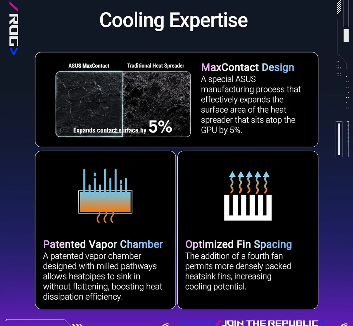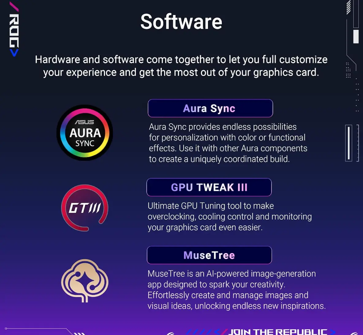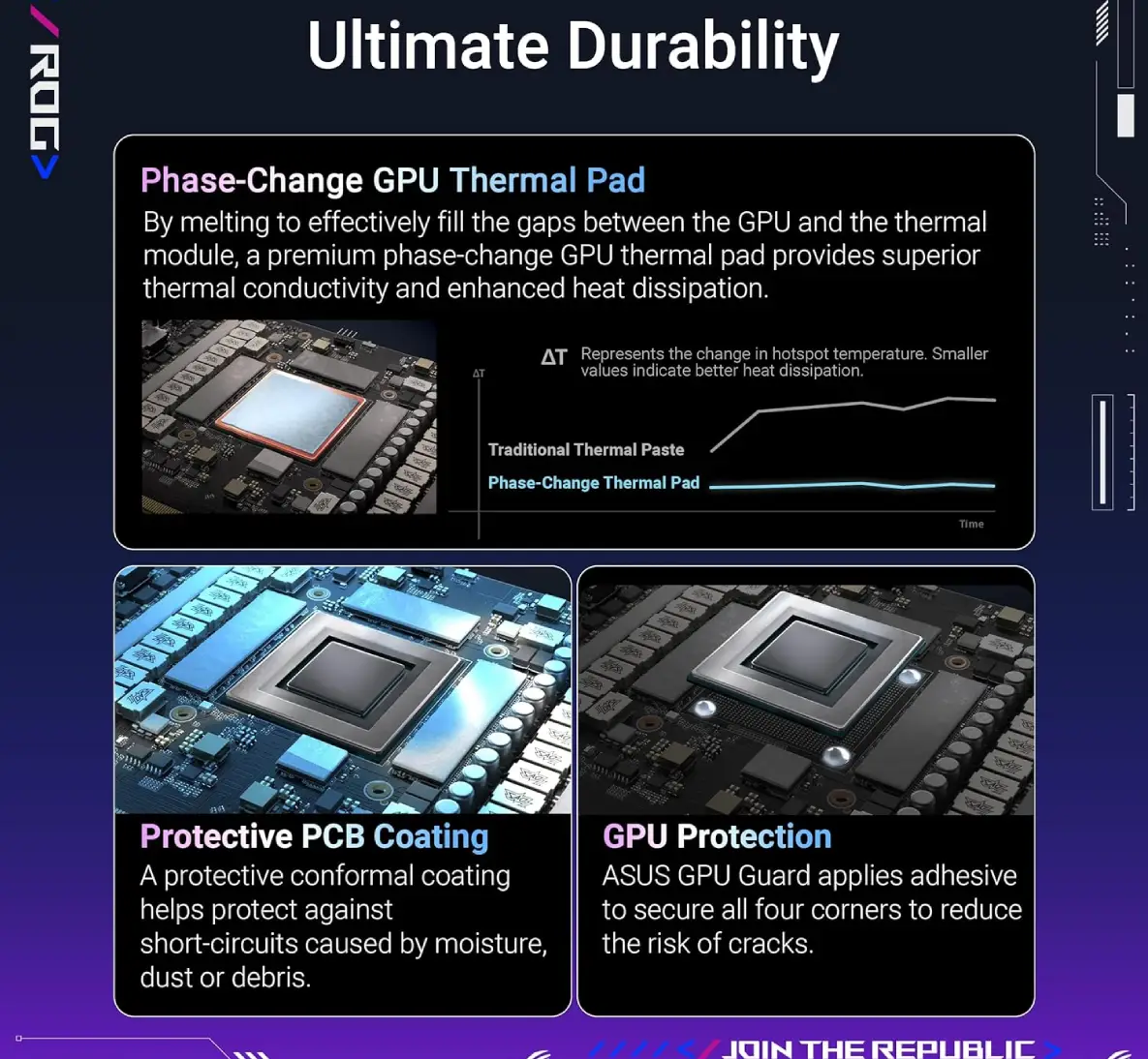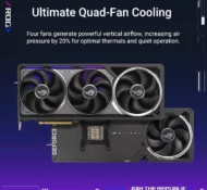Aesthetically, the card exudes ROG’s futuristic design – with ARGB lighting accents, a brushed metal shroud, and customizable Aura Sync RGB integration. Engineered with military-grade capacitors and a reinforced metal frame, it guarantees long-term durability and stability.