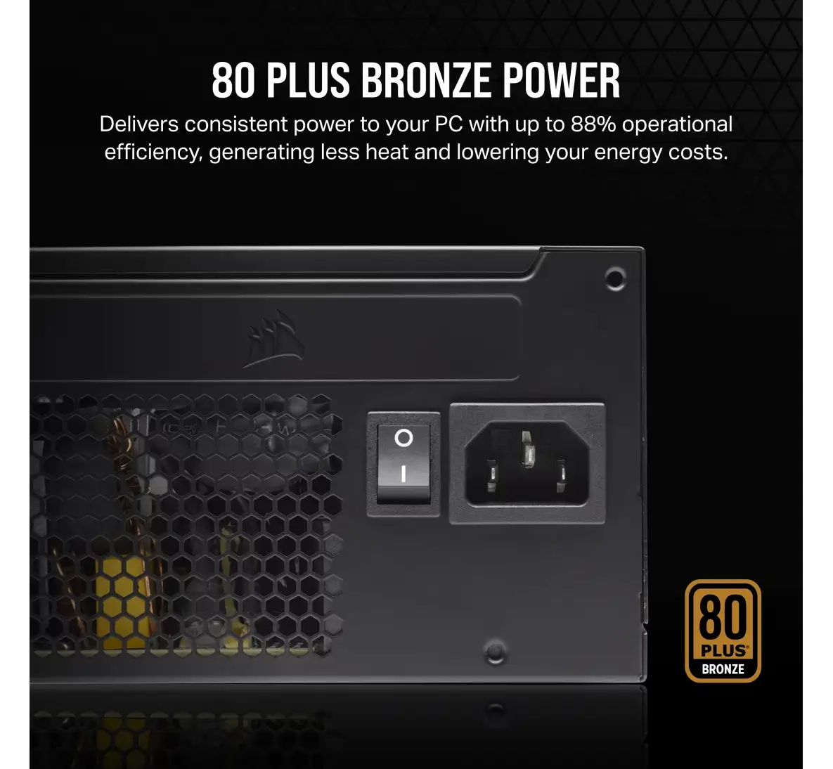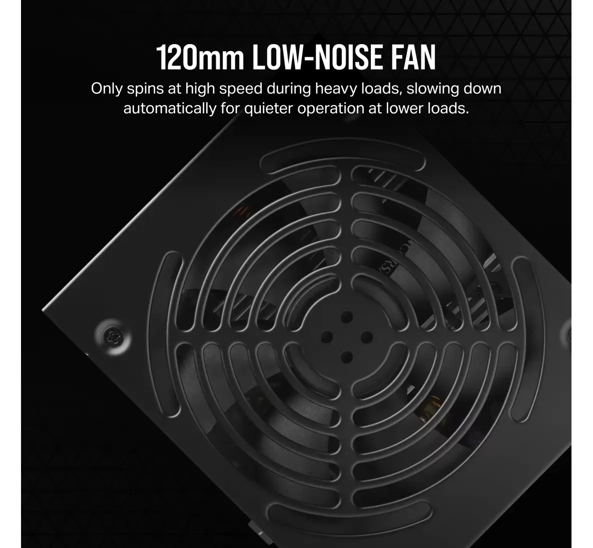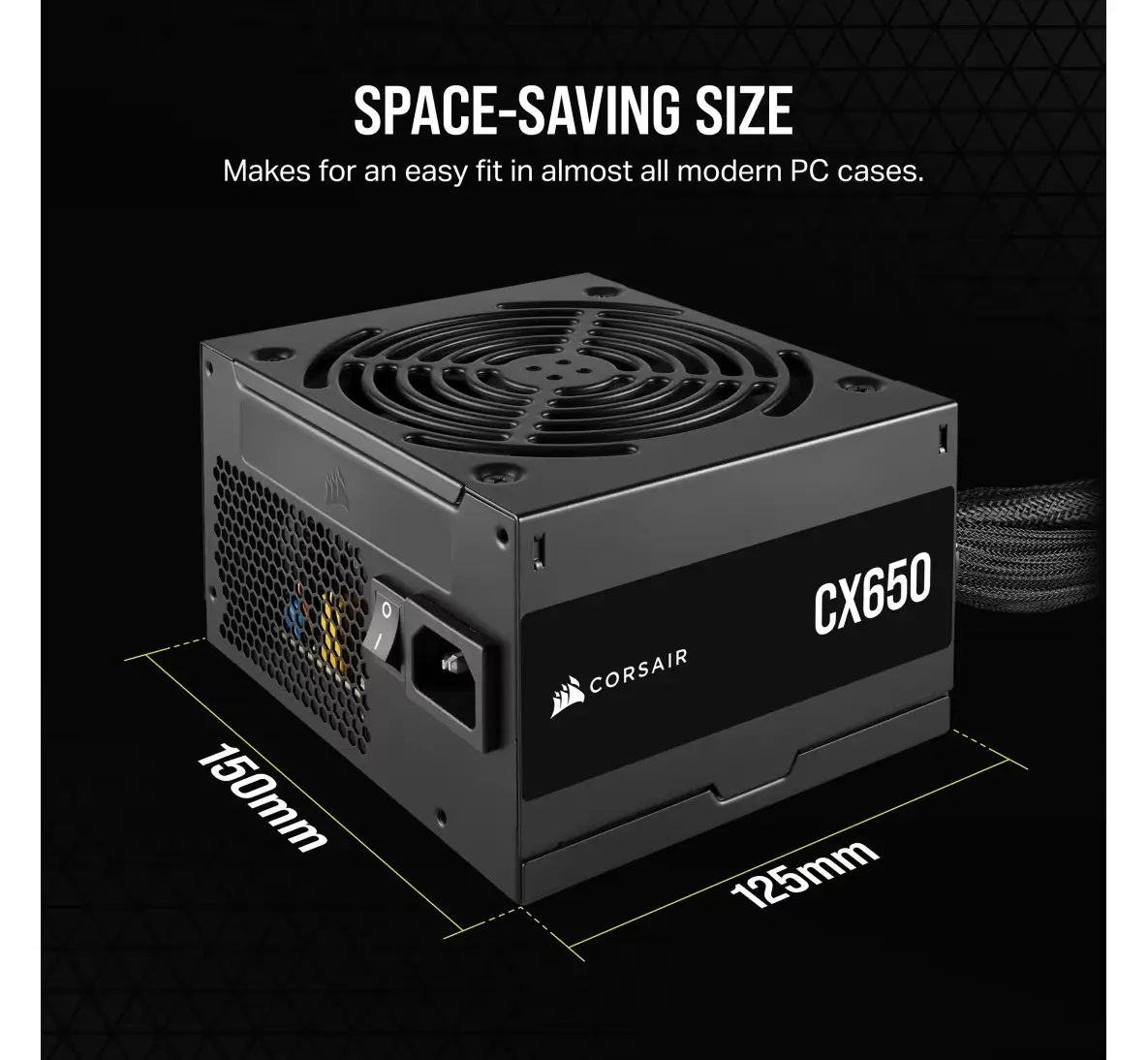The Corsair CX650 combines reliable performance and quiet operation in a compact form factor. With 80 PLUS Bronze efficiency (up to ~88%) and a 120 mm low-noise fan, it’s ideal for mainstream builds. Despite its power, the PSU is just 125 mm long, making it easier to fit in tighter cases — all while delivering guaranteed continuous power.