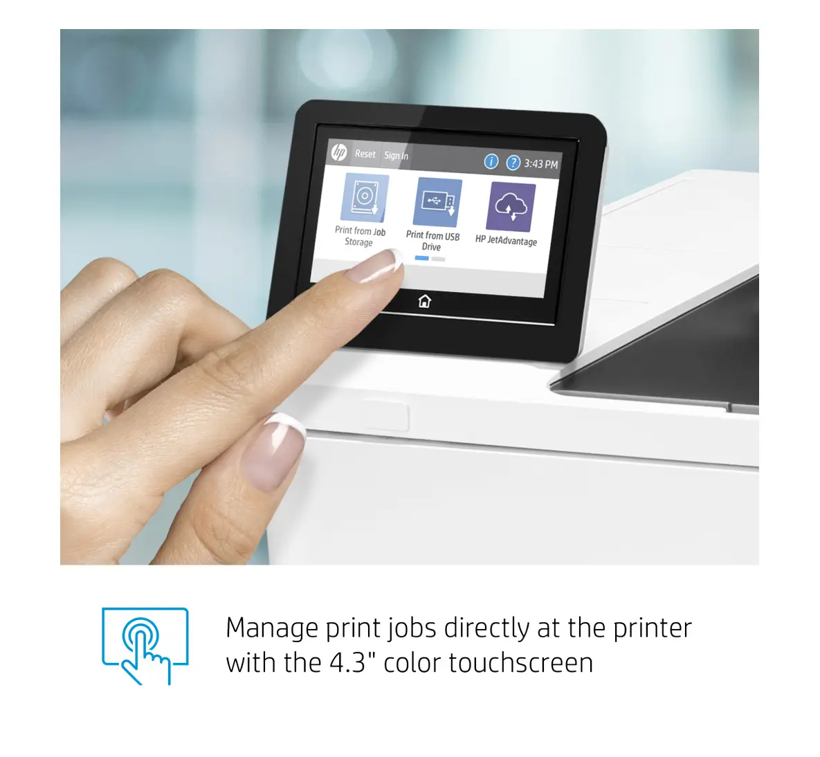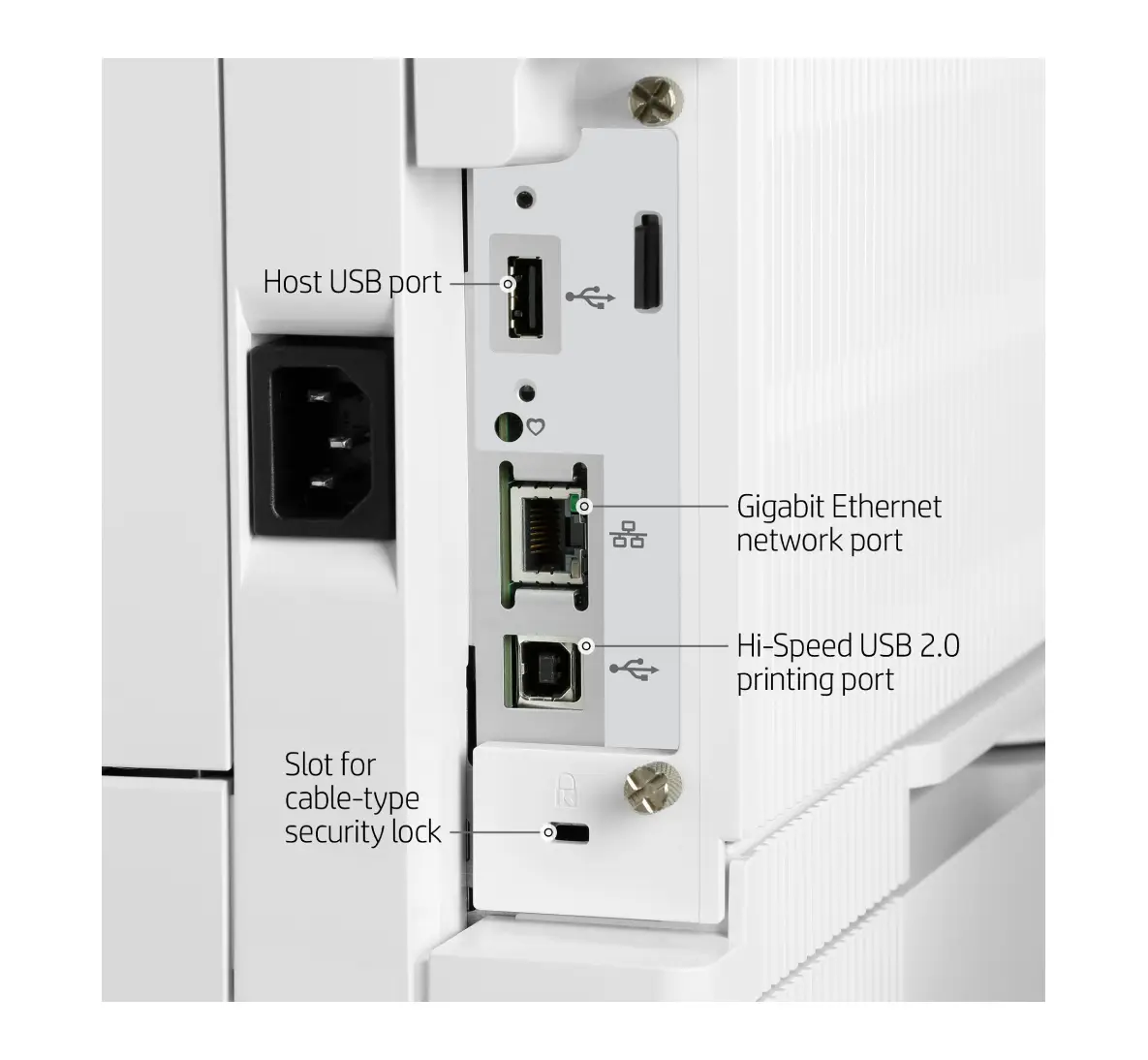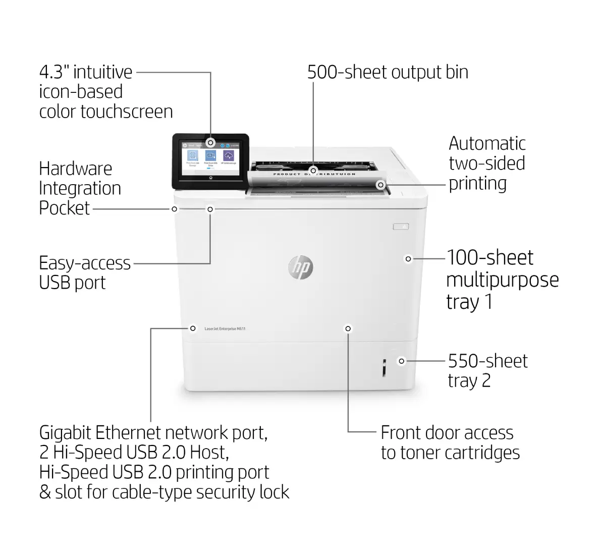 Features: Auto duplex printing, 2 standard paper trays, HP Sure Start security protection