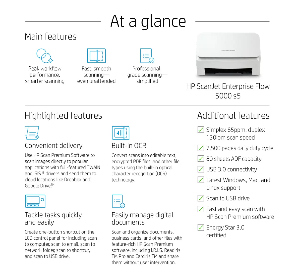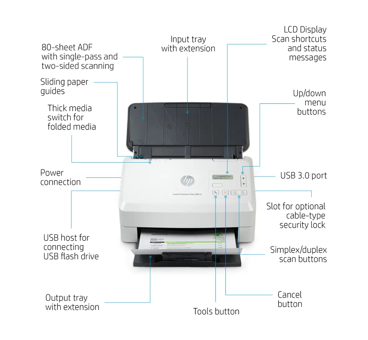 The HP ScanJet Enterprise Flow 5000 s5 delivers exceptional speed, accuracy, and reliability, designed for heavy-duty office environments. With a robust 80-page ADF, built-in OCR, and advanced workflow software, it helps teams digitize documents quickly and efficiently.