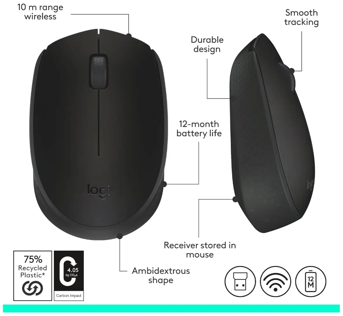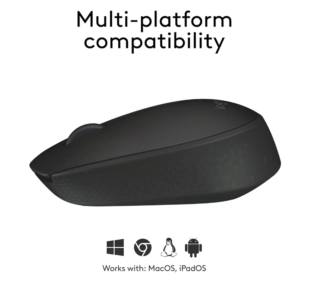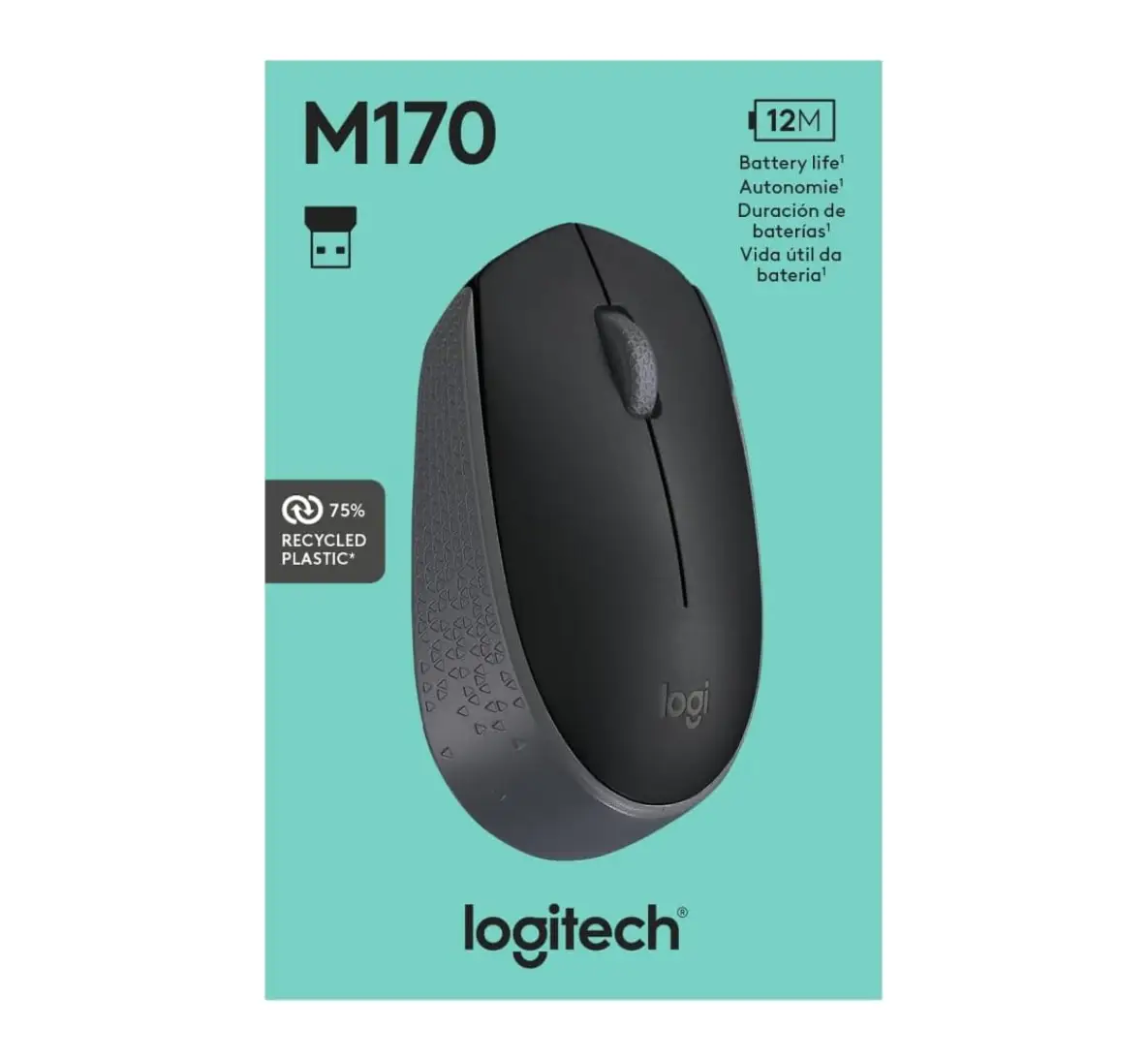 The Logitech M170 Wireless Mouse offers reliable wireless connectivity with a strong 2.4 GHz signal and plug-and-play USB mini receiver. With optical tracking for smooth, precise movement and an ambidextrous design, it’s comfortable for both left- and right-handed users. Its energy-efficient engineering delivers up to 12 months of battery life, making it a dependable everyday companion for PC, Mac, or laptop use.