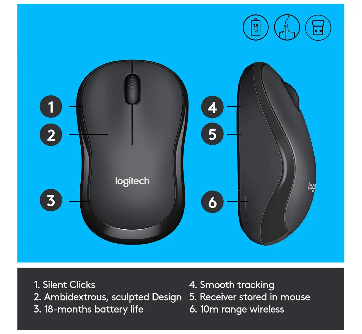 Experience silence in every click with the Logitech M221, designed to reduce noise for a more focused work environment. Its comfortable, compact shape makes it easy to carry, while the 1000 DPI optical tracking ensures smooth, precise control. With up to 18 months of battery life and an ambidextrous design, it’s the ideal everyday mouse for home, office, or on the go.