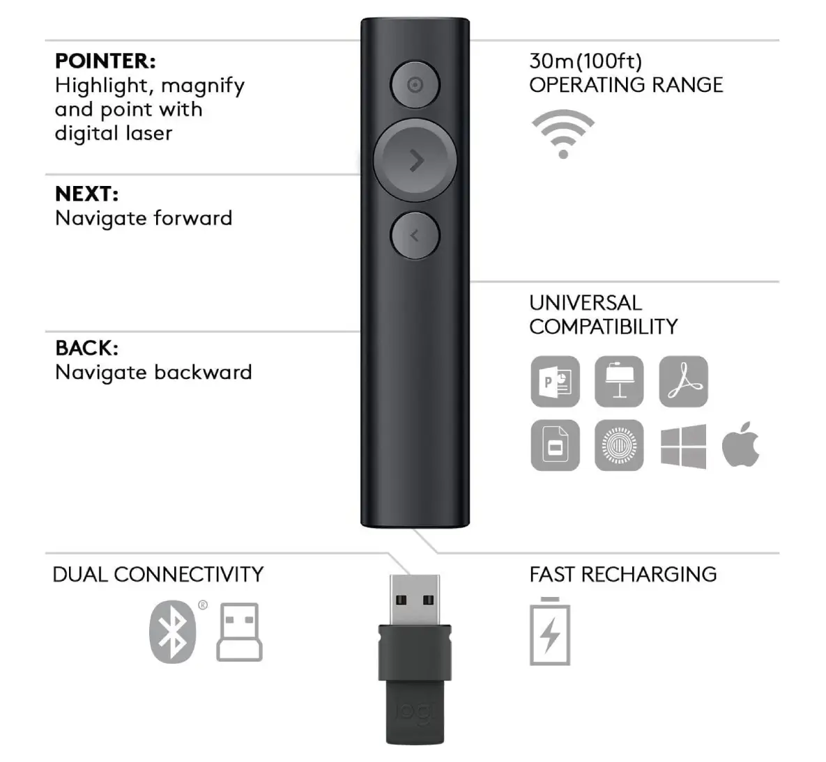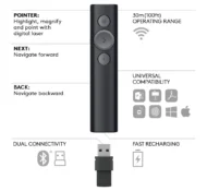 The Logitech Spotlight sets a new standard in presentation control, designed to keep audiences engaged in any setting — boardroom, classroom, or virtual. With advanced highlighting features, intuitive slide navigation, and a sleek silver design, it ensures your message stands out clearly and professionally.