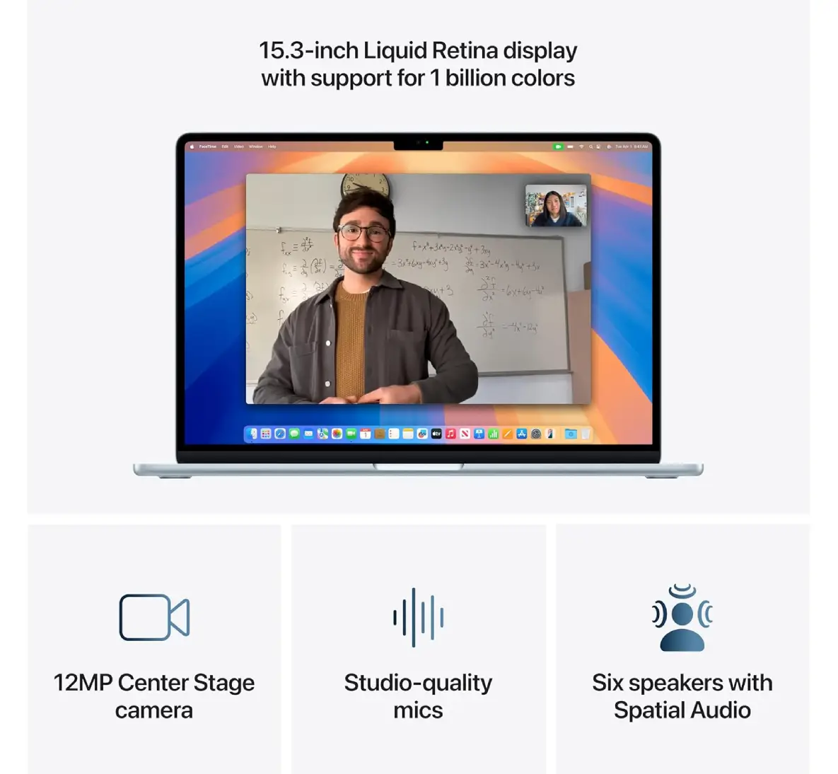 Everything looks and sounds amazing with a 12MP Center Stage camera, three mics, and six speakers with Spatial Audio.