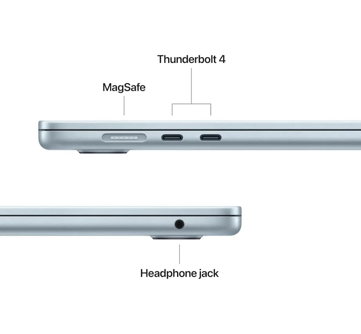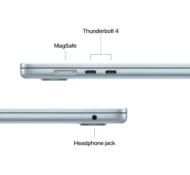 MacBook Air features two Thunderbolt 4 ports, a MagSafe charging port, a headphone jack, Wi-Fi 6E,* and Bluetooth 5.3. And it supports up to two external displays.