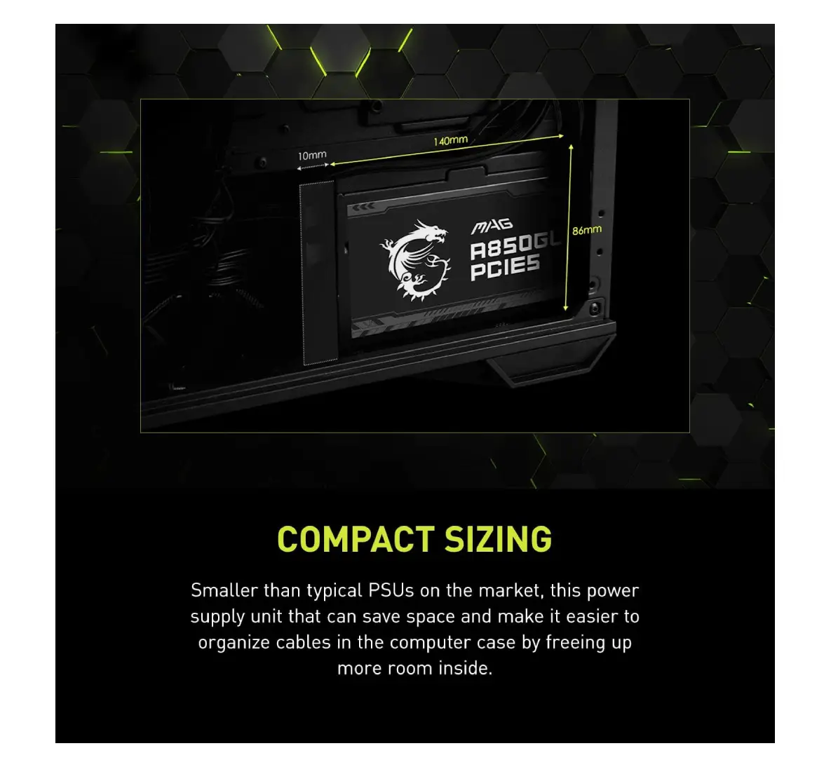 Step into next-gen performance with the MSI MAG A850GL. This compact but powerful PSU offers 850W of reliable power, 80 PLUS Gold efficiency, and full compatibility with ATX 3.0 / PCIe 5.1 standards. Its fully modular design ensures cleaner builds, while LLC + full-bridge topology provides stable voltage regulation under load. Built for gamers, it carries the rugged aesthetic of MSI’s MAG series — combining strength, style, and performance in one.