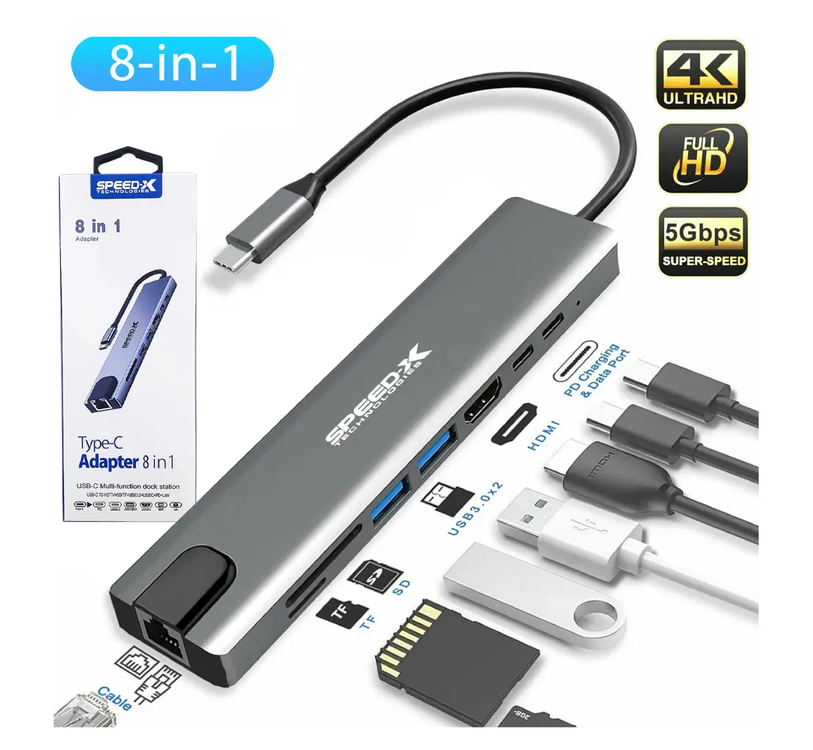 Speed-X 8 In 1 Multi-Port Type-C 4K HDMI USB 3.0 Converter